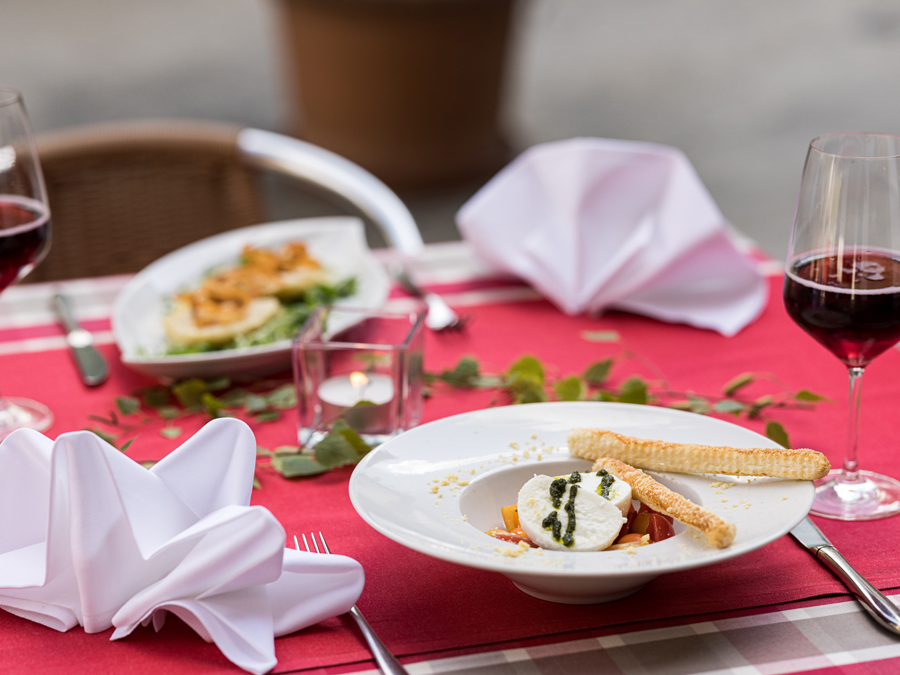 Das Beste aus der alpinen und der mediterranen Küche genießen könnt ihr mittags oder abends à la Carte in unserem Restaurant, das nicht nur für Hotelgäste geöffnet ist. Wählt dabei selbst aus, ob ihr in der öffentlichen Bar, auf der gemütlichen Sonnenterasse oder im heimeligen Wintergarten sitzen möchtet.
